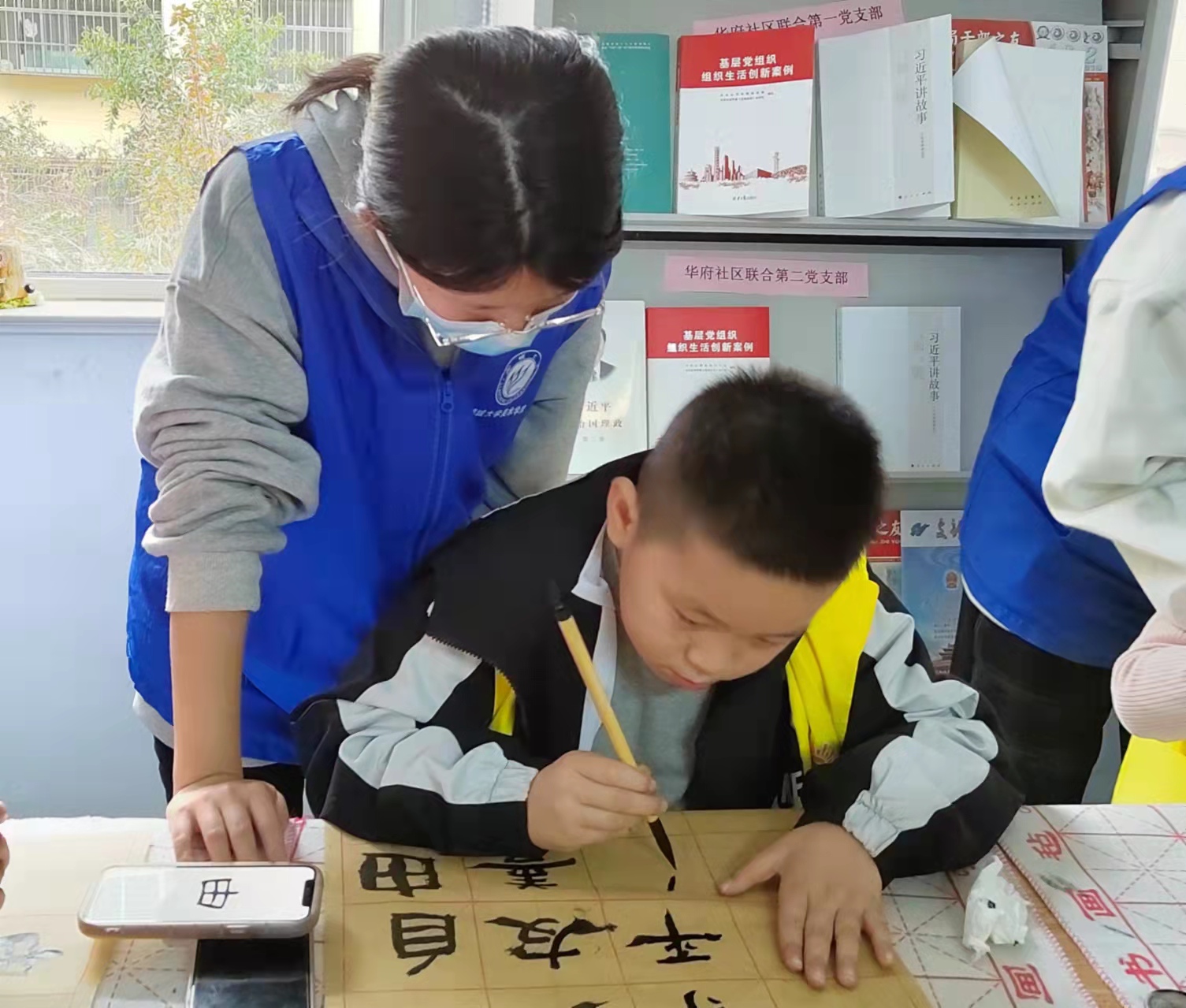 活动负责人和华府社区负责人在活动前期共同准备好各项事务,同时联系社区人员对活动场地进行消毒,以贯彻疫情防控工作。志愿者们提前到达华府社区,将毛毡、毛笔和墨盘等工具摆防整齐,安排小朋友们有序就坐。志愿者们运用图文并茂的形式给小朋友们介绍了关于创建文明城市的知识,小朋友们遇到不理解的问题时会举手提问,志愿者们对这些问题耐心地进行解答,使小朋友们对于创建文明城市有了更深刻的认知和理解。志愿者们向小朋友们提问关于社会主义核心价值观的内容时,小朋友们争先恐后地回答,接着志愿者们就此引出本节课要书写创作的内容——社会主义核心价值观。志愿者们给小朋友们分配好要书写的内容,小朋友们就迫不及待地想要运用上节课学到的隶书知识进行创作。在小朋友们书写的过程中,志愿者们耐心指导,还时不时地进行鼓励,最后,一幅幅倾注认真和用心的作品展现在了大家眼前。