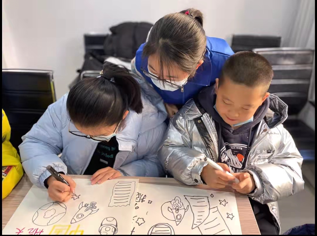 活动前期,志愿者们提前到达了社区,并且准备好活动所需要的工具。活动开始后,志愿者们通过PPT向小朋友们讲述关于中国航天的相关知识。志愿者一边讲述着他们所了解的航天知识,一边积极的与小朋友们进行课堂互动,构想一幅幅关于未来航天事业的美好想象,现场气氛十分活跃。随后,志愿者们以通俗易懂的小故事向小朋友们讲解航天知识,PPT屏幕上也放出了关于航天的手抄报图片。小朋友们根据图片视频和航天故事,绘制着自己的作品。绘画过程中,小朋友们在图片和依靠志愿者的帮助下,画出了自己心中独一无二的航天英雄。