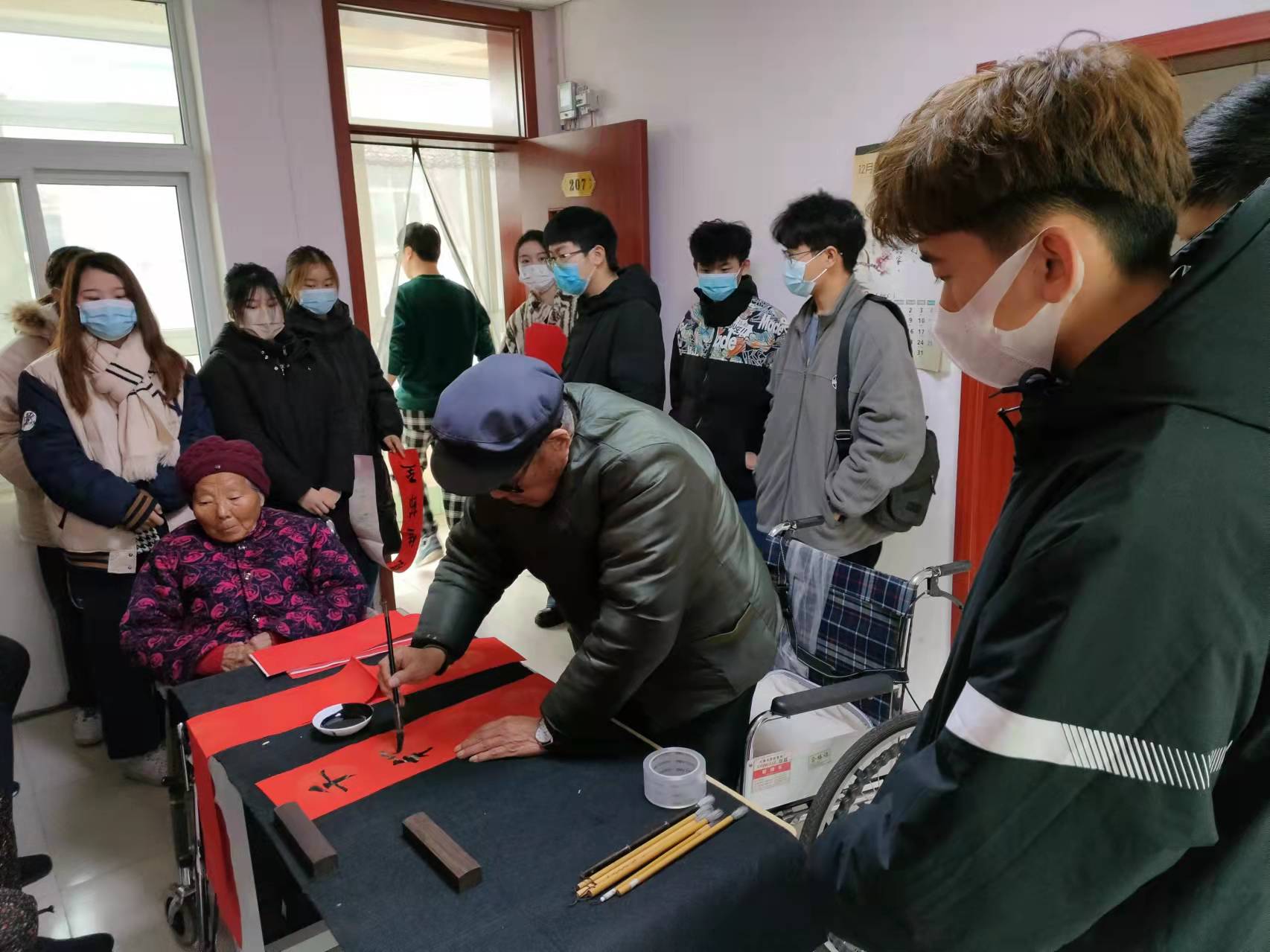 本次社会实践活动主要以贴春联,写福字的方式展开,首先由学院的专业人员先临摹一张范图之后让老人们动手动脑的来完成属于自己的作品,同时也宣传了疫情防控的重要性,加强老人们疫情防控的能力。随着活动的进行,老人们的兴致也逐渐高涨,每位老人都动手完成了一幅又一幅的春联并激动的向服务者们来讲述自己的作品优点,服务者们看老人们非常热衷于本次的社会实践活动,并提出和他们一起把自己的春联贴在自己的房间。随着活动的渐渐步入尾声,每位老人拿着自己创作的春联与服务者们亲切的合照,为本次的社会实践活动画上了圆满的句号。同时让我们走进了老人们的内心,让老人们以写春联的方式感受到冬日的温暖,