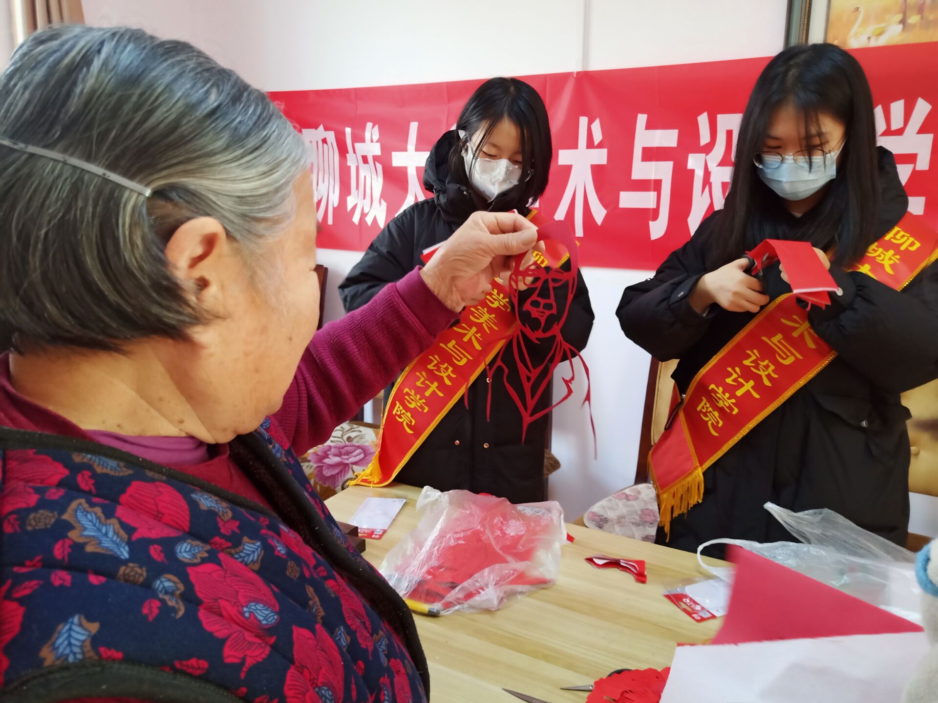 志愿者为使活动顺利进行,提前分配好活动工具,准备好相关的传统剪纸图案供老人们挑选。志愿者与老人们共同协作,以党为主题,进行关于有关党的图案制作。随后,志愿者们拿出准备好的剪纸样式,让老人们挑选自己喜欢的进行剪纸,在志愿者们的协力合作下,一张张鲜红的纸张赋予生命的灵魂,红星和一些人物头像等具有中国特色和精神气质的元素被镌刻在了纸上。小小的剪纸在志愿者们的手里不仅仅是民间艺术传统的代表,也是红色文化的寄寓载体。精雕细琢的剪纸之上,讴歌了历史的巨变,描绘了改革的华章。