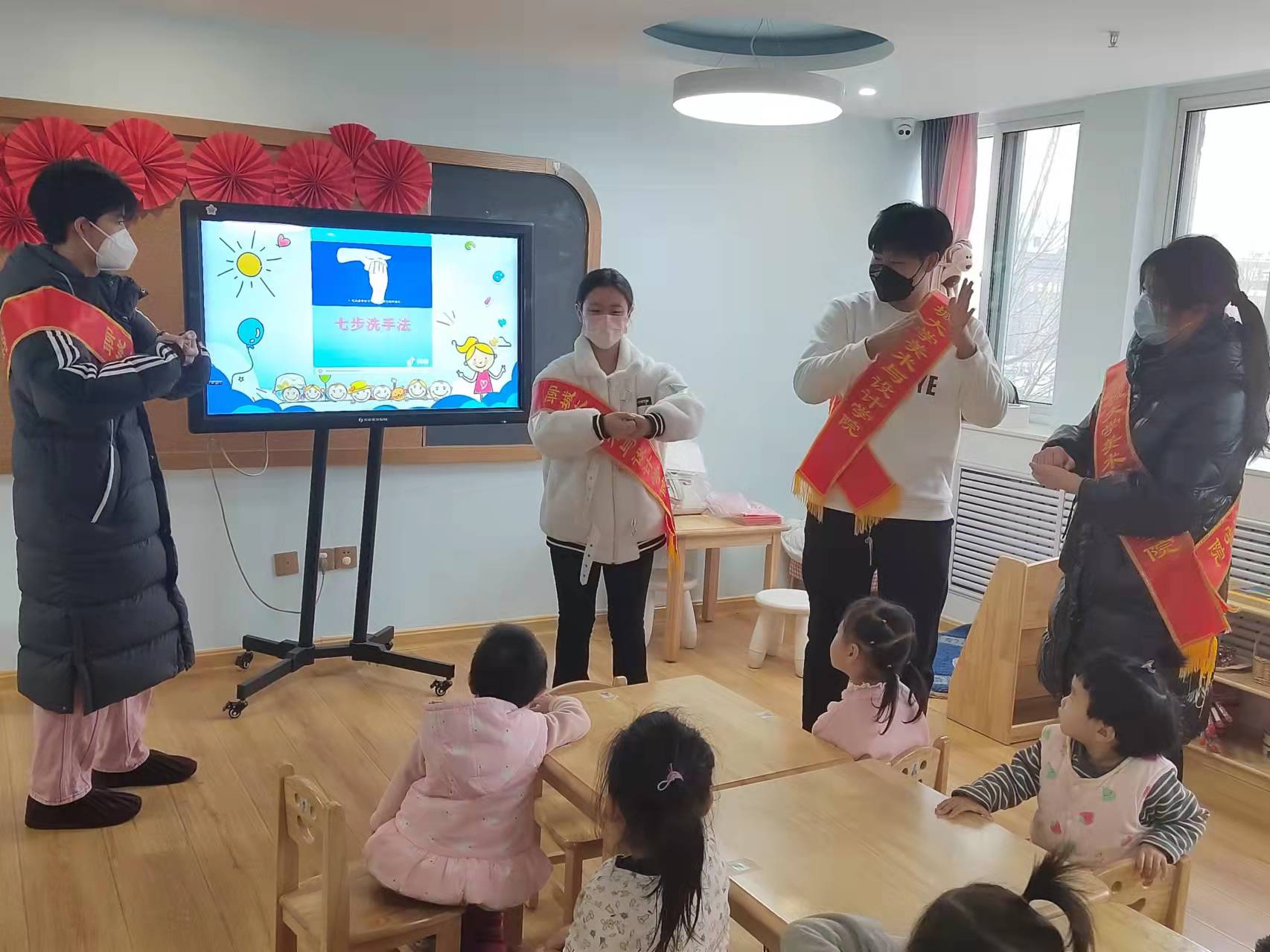 志愿者们发现,由于小班孩子动手能力比较弱,在幼儿园经常有小朋友洗手时会出现洗手马虎、玩水现象。针对这种情形,为了让小朋友们了解并学会正确科学的洗手方法,从而养讲卫生的好习惯。志愿者们组织小朋友们观看七步洗手相关视频,使其更加深入的了解、学会。通过PPT展示七步洗手法,将七步洗手法口诀教给小朋友,每一步志愿者们各自带领小朋友们亲自展示并教会其动作要领。在分步学会之后,又邀请了一位小朋友上台展示一套连贯的七步洗手法给大家,尽管中间会有一点卡顿,但是在志愿者们的耐心提醒下,小朋友也完整的展示了一遍。用七步洗手法清洁自己的手,清除手部污物和细菌,预防接触感染,减少传染病的传播。对于疫情,我们要做的就是积极的防控。活动最后,志愿者叮嘱小朋友们,要牢记洗手口诀,饭前洗手,饭后洗手,公共场合佩戴口罩,要通过自己的努力,养成爱干净,防疫情的好孩子。