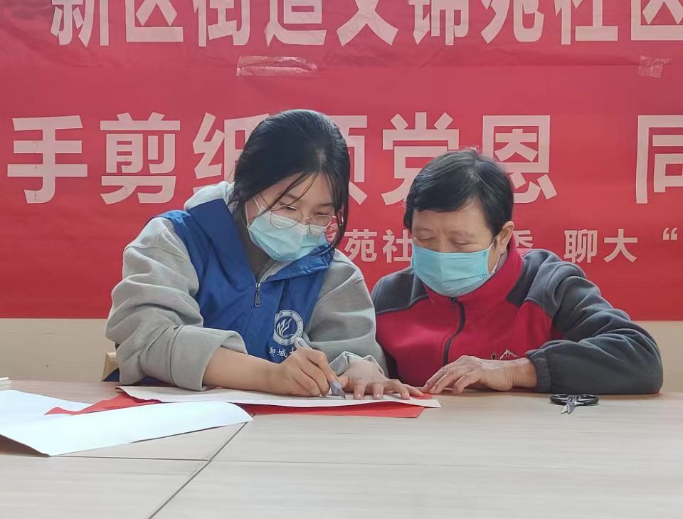 剪纸文化作为我国最流行的民间艺术之一,备受大家喜爱与追捧。此次活动,志愿者们确定以党史为创作内容,采用剪纸的形式,将社会主义核心价值观与中国传统元素相结合,查阅相关资料,学习掌握“折、画、剪”的方式与技巧。到达社区后,志愿者井然有序,与老人们分为不同的小组进行传统剪纸图案制作。大家相互配合,共同完成铅笔起型、裁剪与细节刻画等步骤,志愿者耐心讲述其中的窍门和技巧,老人们能很快了解、掌握剪纸的基本技能。在志愿者的帮助下,一张张生机勃勃,妙趣横生的图案跃然而出,老人们将朱红色的剪纸贴在洁白的卡纸上,互相展示自己的作品,现场气氛愈发活跃。