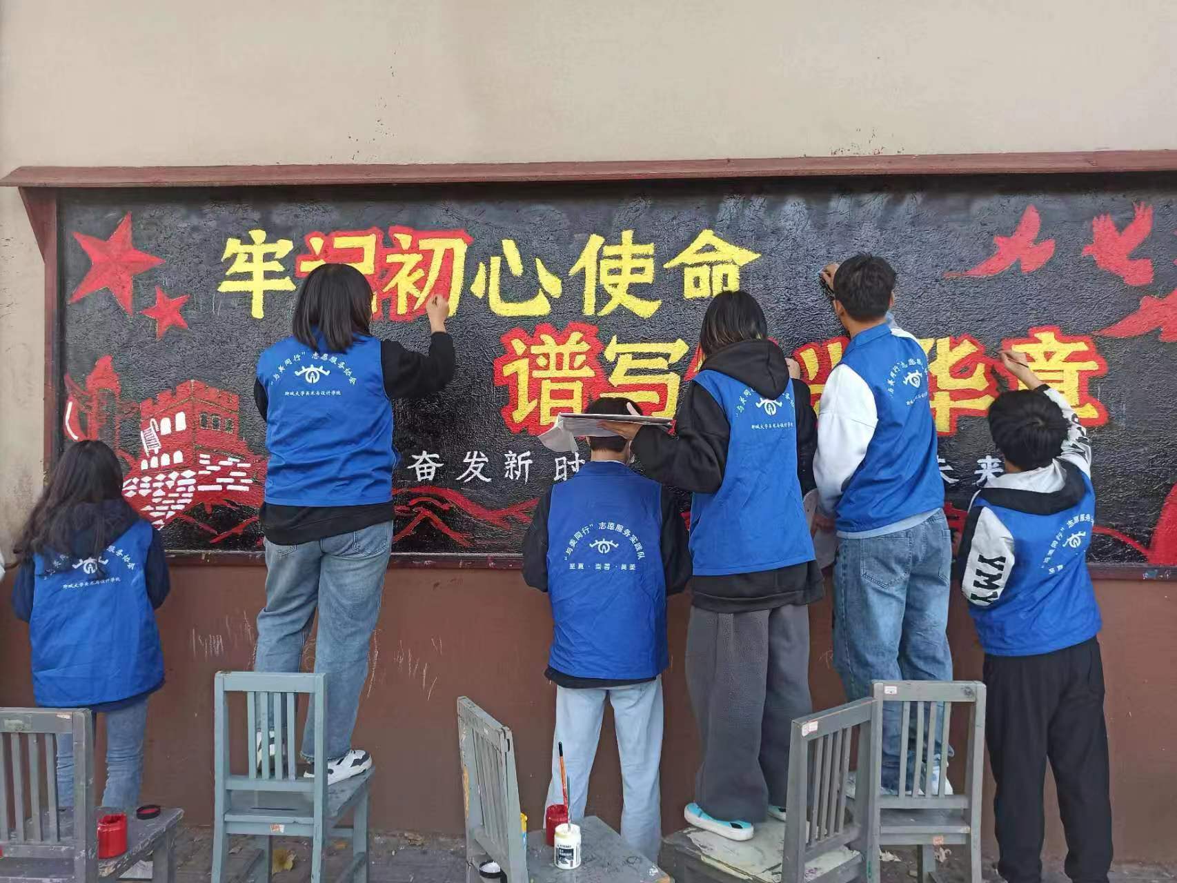 历史赋予使命,时代要求担当。绘制正式开始前,志愿者们首先将墙面清理干净,分组合作,用粉笔进行起型。不同于在纸面上绘画,墙面常年裸露在外,表面凹凸不平,有些地方还镶嵌着锋利的石子,提高了绘制难度,也考验着志愿者们的随机应变能力。绘画过程中,志愿者们相互配合,用金黄色的颜料勾画主题字,再用朱红色的颜色为主题字描边。“牢记初心使命,谱写复兴华章”这几个大字熠熠生辉,金黄的文字镶嵌在朱红的背景里,如炽热的火焰,如鲜明的旗帜。这两种颜色交织在一起,与校园色彩斑斓的秋景相辉映,形成了一道别样的风景线。经过一下午的努力,板报墙焕然一新,路过的老师同学纷纷驻足观看,拿出手机留影,志愿者们则热情地向大家介绍起板报的宣传思想。在离开前,志愿者们秉持着保护校园美丽环境的理念,仔细将现场卫生打扫干净。