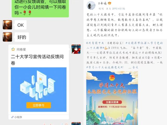 活动开始,由部门负责人员通过沟通选择合适的宣讲内容,融合党的二十大精神内容,互相分享与学习。同时负责线上活动宣传的志愿者们征集更多有意愿学习的同学参与宣传,并邀请他们加入事先设立好的群聊,提倡和鼓励大家积极发言,互相沟通学习。在活动过程中,还要求同学们在群聊中学习发送的相关内容,并在各自的社交软件进行上截图和转发,并由志愿者们进行记录和收集。活动尾声,参与此次活动的同学们也表示应当自觉学习和践行党的二十大精神,从而响应国家号召,为国奉献。在同学们的积极配合以及志愿者们大力宣传下,这次活动圆满结束。
