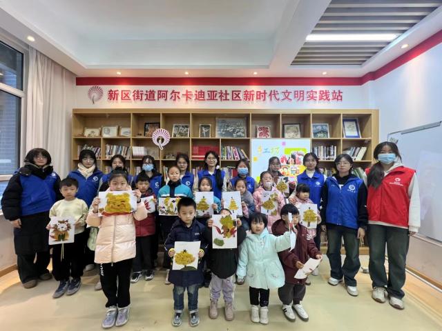 活动伊始,志愿者们先向小朋友们分发落叶、双面胶等材料。随后,由一名志愿者向小朋友们讲解制作步骤及注意事项,小朋友们听的聚精会神。讲解完毕后,志愿者们在旁指导小朋友们制作落叶。现场活动气氛热烈,大家互相帮助,积极交流制作经验。小朋友们张开想象的翅膀,化身小小艺术家把一片片形状各异的树叶进行剪切拼接和粘贴,在欢声笑语中,一幅幅独具风格的画作便展现在大家面前。活动最后,志愿者们和小朋友们拿着自己的手工作品进行合照。